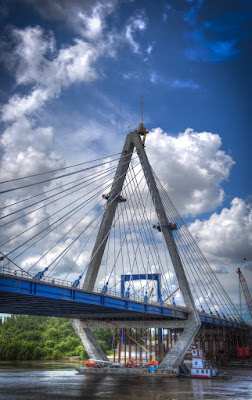 Journeyed down to the rivers edge to check on the Bond Bridge construction. Tons (literally) of progress to report including the fact that it's almost shore to shore. Very small, relatively speaking, space to go before the span touches north and south banks. Above is the view from above the Isle of Capri fake water feature.... the casino takes river water and pumps it through their grounds and then that circuit is complete with the return to the stream shown above. Above a panorama under the south end of the bridge showing the only gap that remains to be closed. Paseo Bridge is on the left. The new bridge is scheduled to be finished by this time next year. The north end was constructed using steel supports.... after the midpoint was reached the southern half of the bridge was cantilevered out since the river channel had to be kept open for barge traffic. The river's high level this year has slowed progress somewhat since much of the work is done from barges which also bring a lot of the supplies out to the work site. When finished and illuminated by thousands of led lights that will be computer controlled the bridge will be stunning... The top of the delta pylon is roughly 316 feet above the river's surface.... As mentioned previously tugs, like the one pictured above, scurry around the supports of the structure all day. The remaining gap between in the bridge near the south shore seen above. Below, that same gap from the endpoint. Above and below the deck will soon stretch completely across the river.... in the above photo you can see the small crane atop the delta pylon which ferries men and equipment to the top.