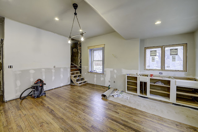 Below, looking from the living room into the dining room. The roof was allowed to deteriorate to the point that the second floor ceilings collapsed.. you can see damage to the first floor above the fireplace. All has been repaired.
